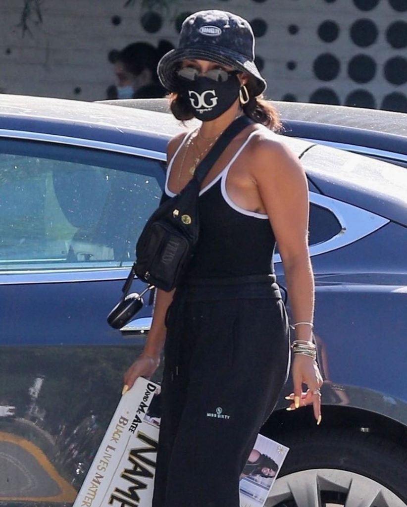 Con un equipo deportivo de pantalón y musculosa en negro con vivos blancos y gorro estilo Piluso, Vanessa Hudgens combinó su outfit con barbijo en negro con logo en blanco.