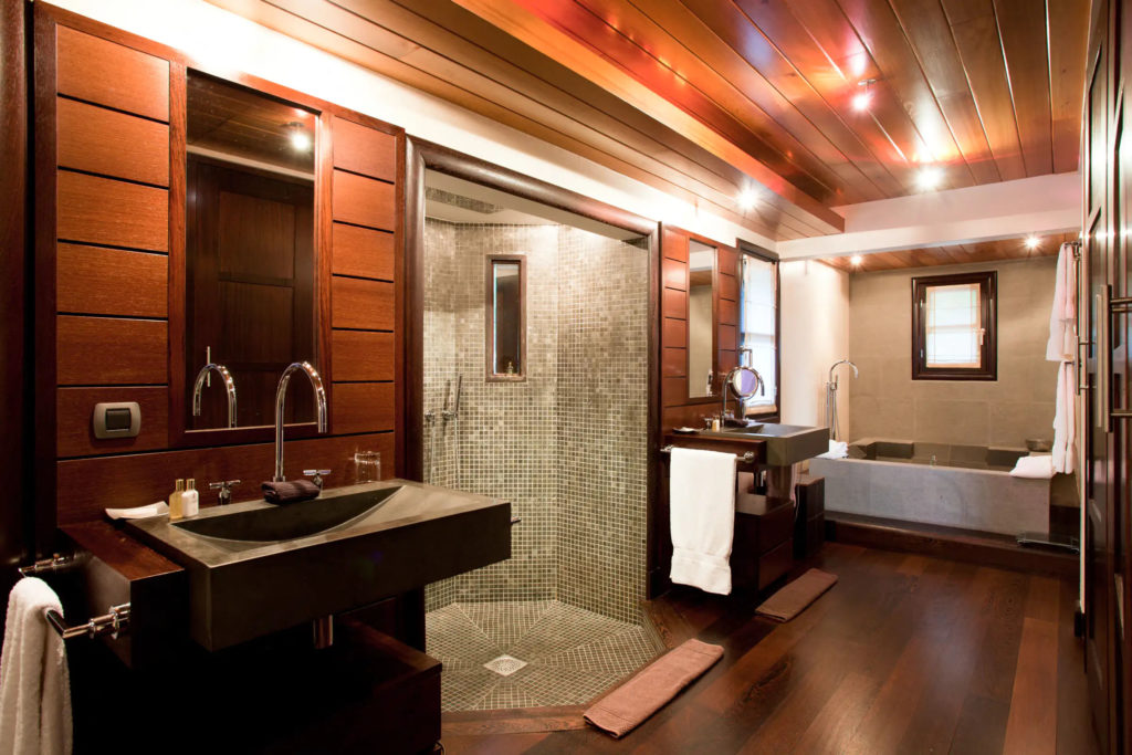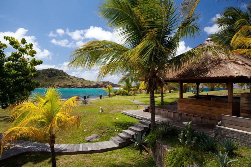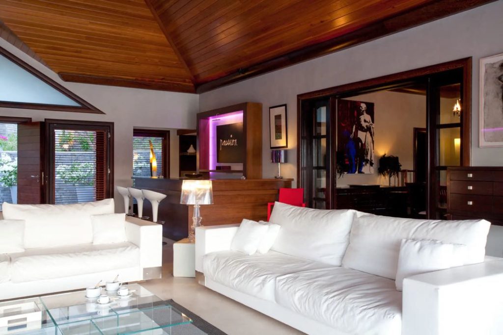 Pero más allá de las destacadas comodidades interiores, son los sectores al aire libre los que le dan un plus a la villa: desde la piscina con forma curva y desborde infinito, o bajo la galería cubierta, se tiene una vista abierta y maravillosa de la isla, con sus suaves montañas cubiertas de vegetación.