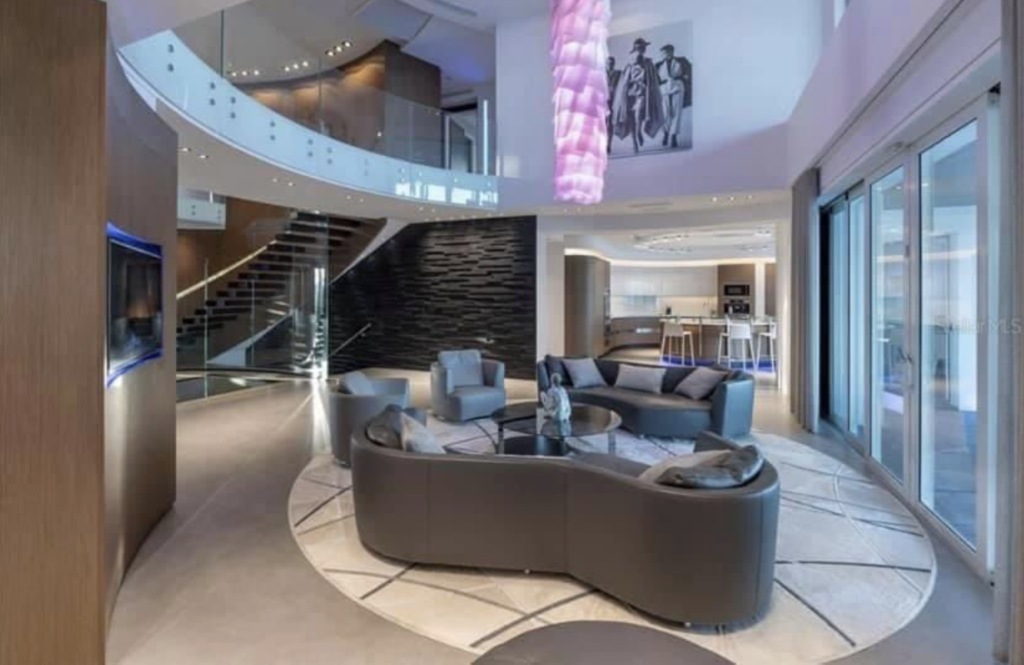 La mansión, que se destaca por su diseño curvo, cuenta con varias salas de estar con detalles súper modernos y mobiliario de primera línea.