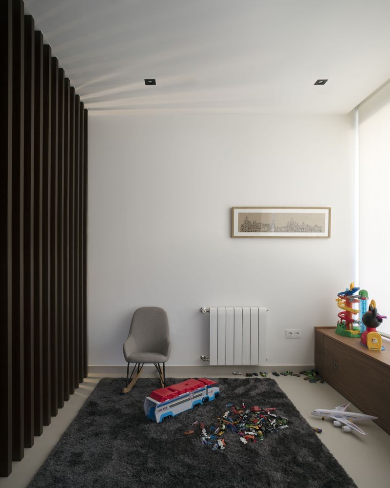 Nada define un ambiente de otro de manera precisa. Se utilizaron recursos tales como lamas para dotar de cierta independencia a la zona de juegos, sin que se cierre visualmente al resto del espacio.