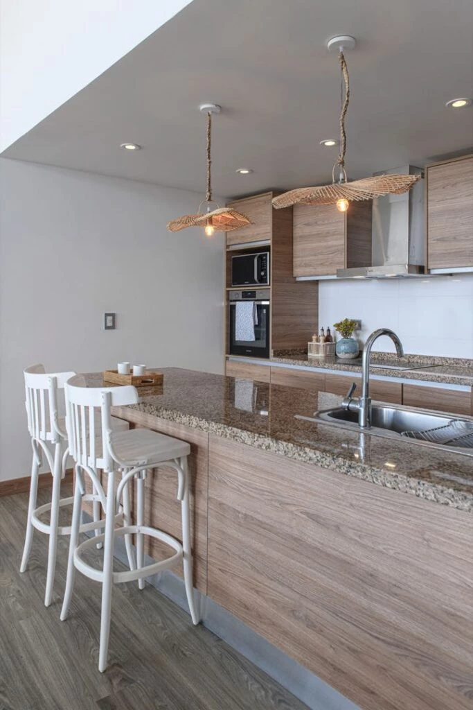 El comedor y la cocina están integrados. La mesa es del modelo Malibú en paraíso laqueado, al igual que las sillas estilo Thonet (@cousy_home). Dos lámparas de fibras naturales caen sobre la barra de la cocina, con sillas altas laqueadas en blanco, y suman luz puntual sobre el desayunador. Los muebles llevan frentes enchapados (@faplac).