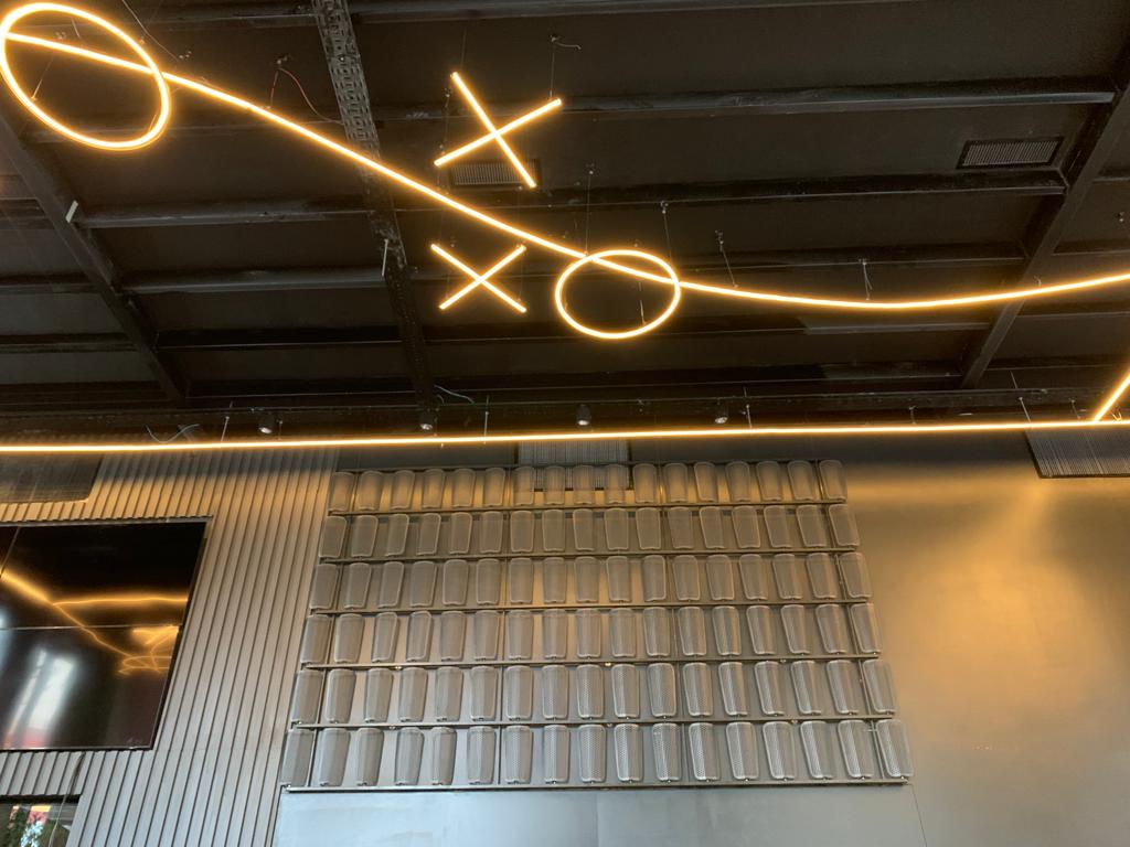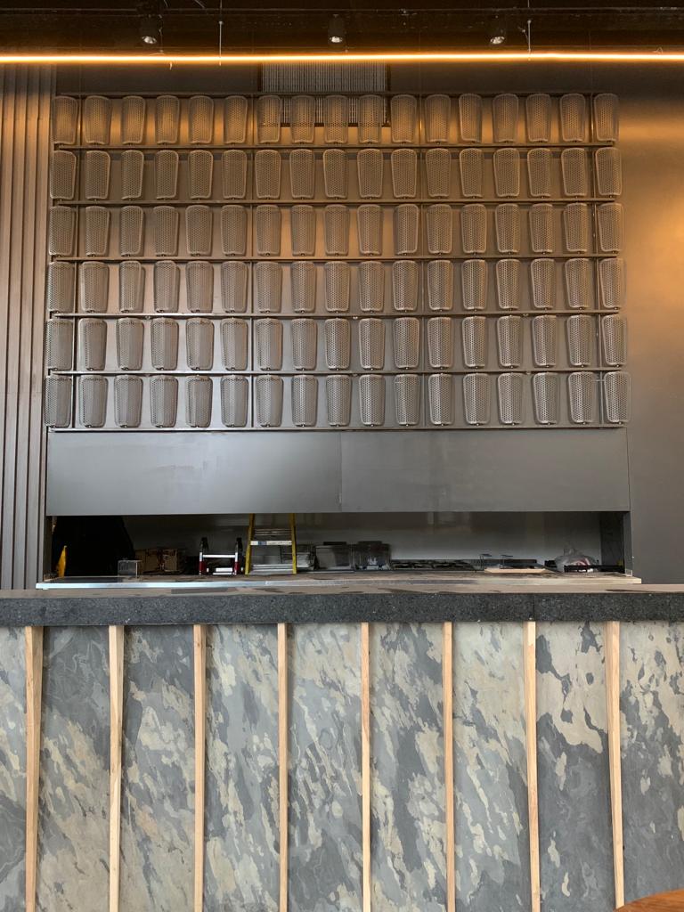 El local cuenta con una barra principal cuyo frente está revestido con unas costillas de madera que interpretan las típicas columnas que sostienen estructuralmente a los estadios de fútbol. La pared detrás de la barra cuenta con un revestimiento de canilleras. Es una estructura de hierro con chapas microperforadas dobladas, colocadas de forma simétrica una arriba de la otra. Para desarrollarlas, junto con los chicos de Krapa, tomamos las canilleras que usó Diego en el 86 y plasmamos la forma de la misma colocando 102 de ellas de forma simétrica arriba de una de las ventanas de la cocina.