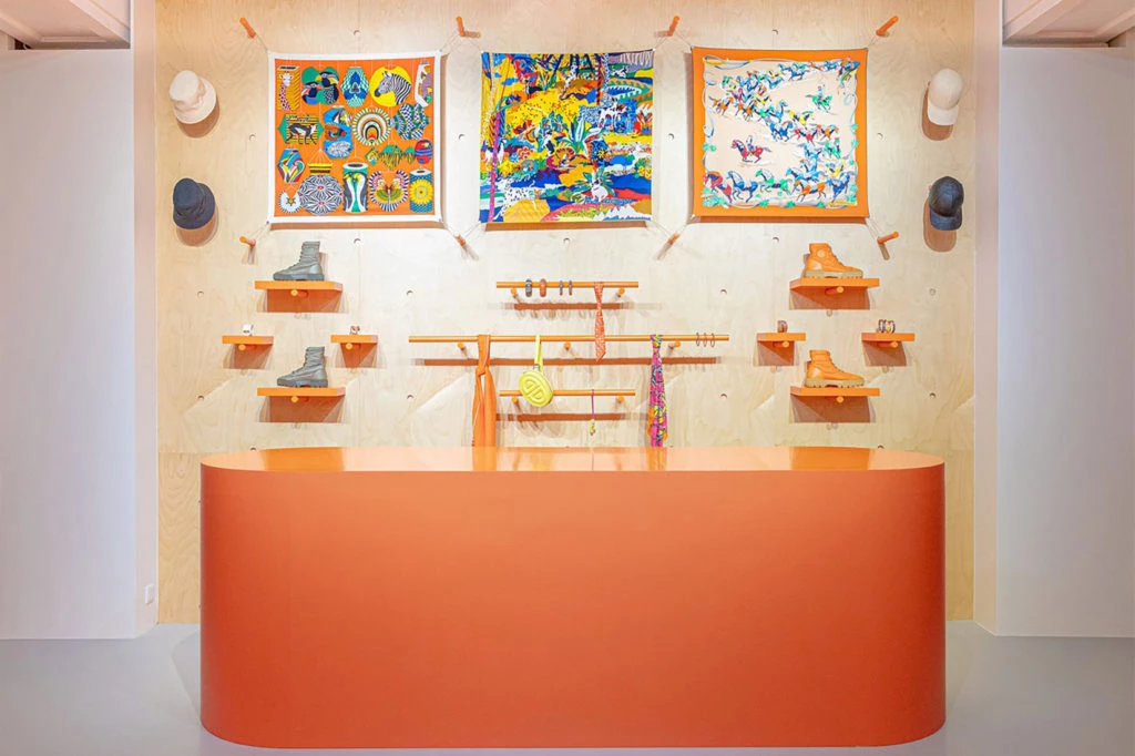 El naranja es el color protagonista y en cada espacio se destacan diferentes artículos glamorosos: desde zapatillas hasta clásicos accesorios de lujo de Hermès como los pañuelos.