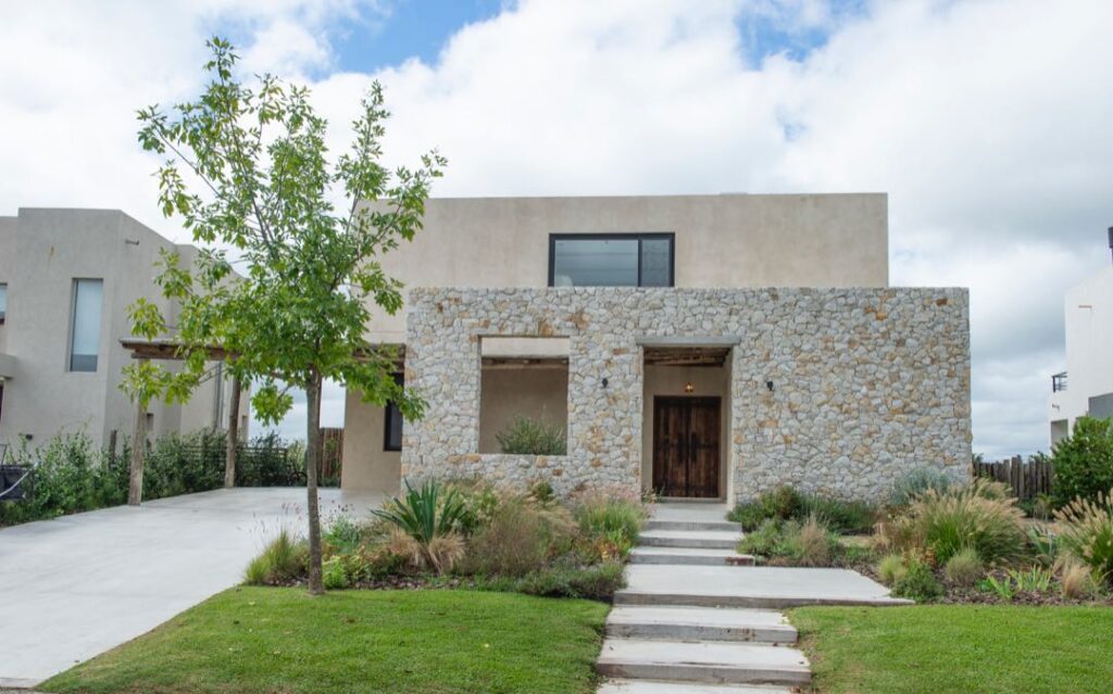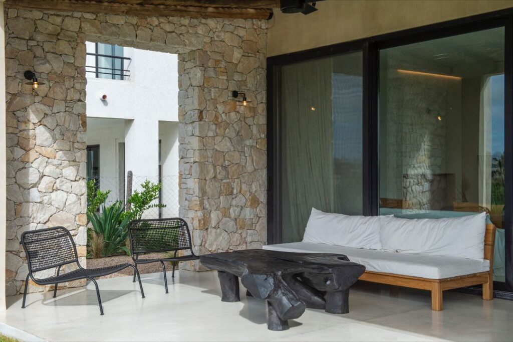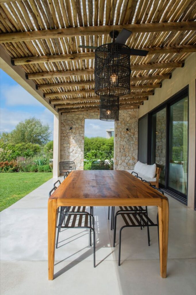 La galería repite el esquema de la entrada a la casa: paredes en piedra voladura Mar del Plata, techo rústico. Junto a la mesa de madera, sillas modelo Ramona (@estudiocanton). En un rincón, con una abertura lateral que recorta el verde, un sillón doble en petiribí (@defourcade) invita al descanso. Lo acompañan dos poltronas (@deco_sillas), una mesa de madera quemada en dos módulos (@primitiva_eduardoblaquier) y unos apliques (@villaraimonda). Paisajismo (@paquitaromano).