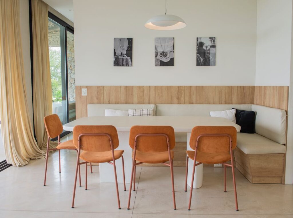 El comedor diario se integra o separa de la cocina a través de un gran cerramiento doble de hierro y vidrio repartido. En este sector íntimo, decorado con fotografías blanco y negro de los sus tres hijos (tomadas por @rochisanguinetti), un banco fijo acompaña a la mesa y las sillas (todo diseño de @casandrastudio).