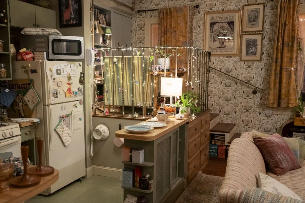 “Su apartamento es un caso de estudio de encanto simple, sinceridad y dulzura -se entusiasma el diseñador de producción- Ella es una persona creativa que ha vivido en el mismo pequeño espacio durante más de 40 años. Y su impulso y optimismo por algún día tener una carrera como actriz se reflejan en su espacio ordenado y bien organizado, resplandeciente con muchos patrones de papel tapiz y una paleta de colores suaves que crean un ambiente acogedor para prepararse para su próxima audición”.