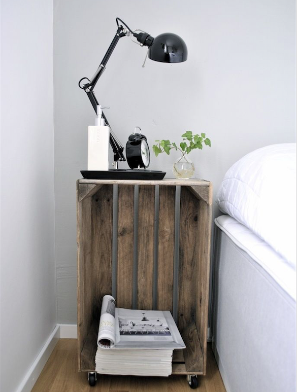 Un buen cajón de frutas apenas reacondicionado (imprescindible, lijarlo a fondo) y al que se le agregaron ruedas, fue suficiente para plantear una mesa de luz diferente, con mínimo gasto y plena funcionalidad.
