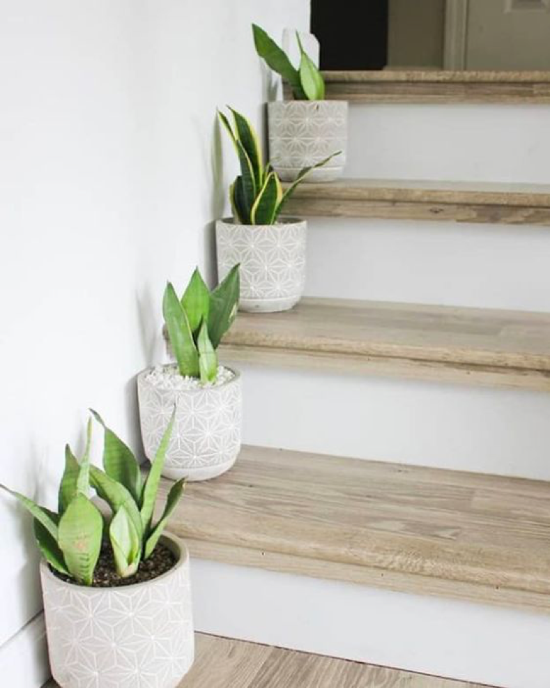 5. Plantas en la escalera. Transmiten calidez, color y vida a cualquier ambiente. En las escaleras existen muchas maneras de incorporarlas. Algunas de ellas pueden ser colgadas sobre la pared dominante, al costado o en macetas en el escalón de descanso.