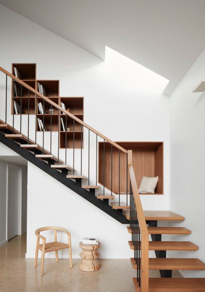 3. Escaleras con estantes. Sirven como espacio para colocar diferentes objetos decorativos como cuadros y macetas. Las estanterías flotantes sin ménsula, son más livianas a la vista por lo que pueden ser una opción más estética.