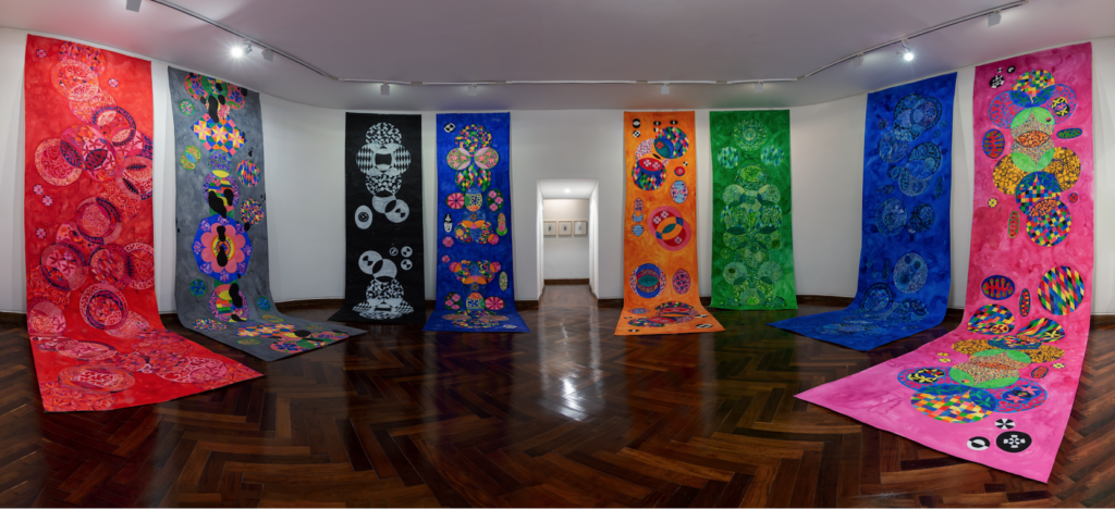 Trabaje en pinturas blancas y acuarelas de color repletas de detalles. Algunas obras median 5 mts y otras 7 mts. Los dibujos blancos y negros representaban mis familiares, y las esculturas blandas de terciopelo me representaban a mi y a las mujeres de la familia. Empecé a trabajar en 2020 y terminé en 2021.