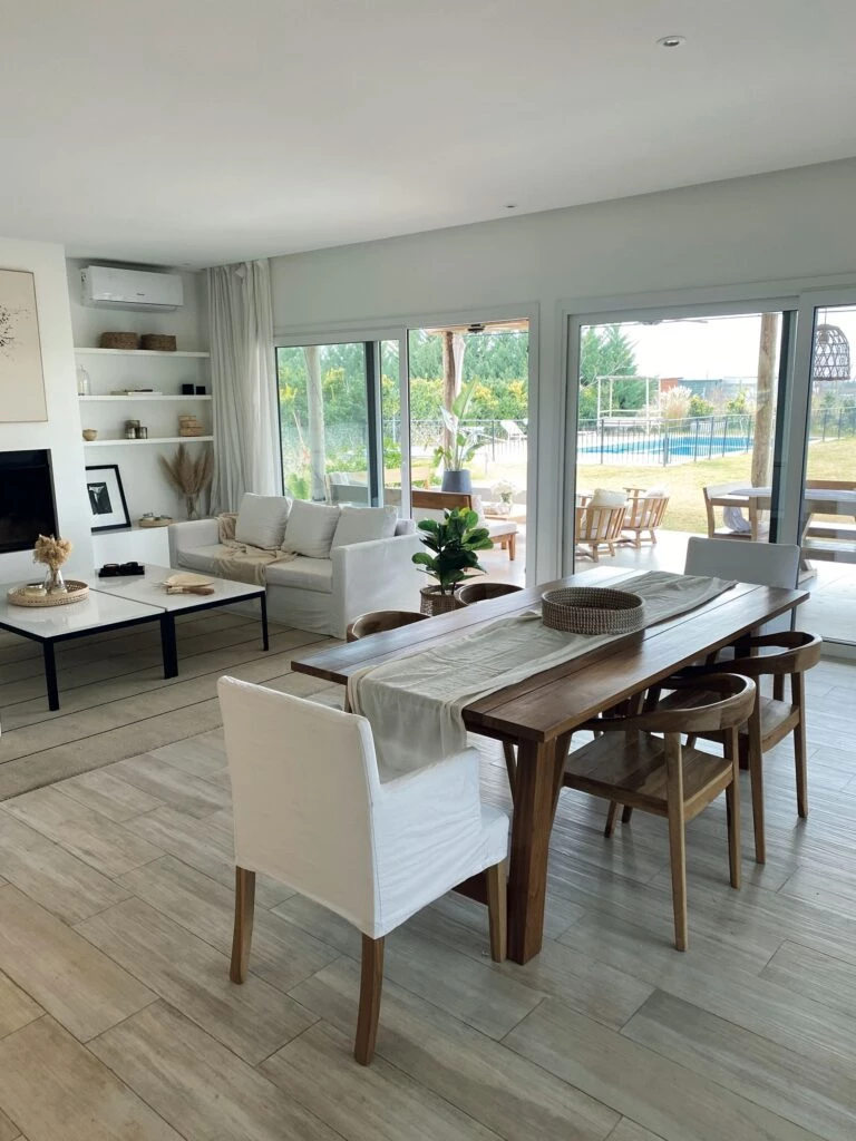 El comedor se abre hacia el living y el jardín. Sobre la mesa de madera, camino y bandeja (@susahomedeco).