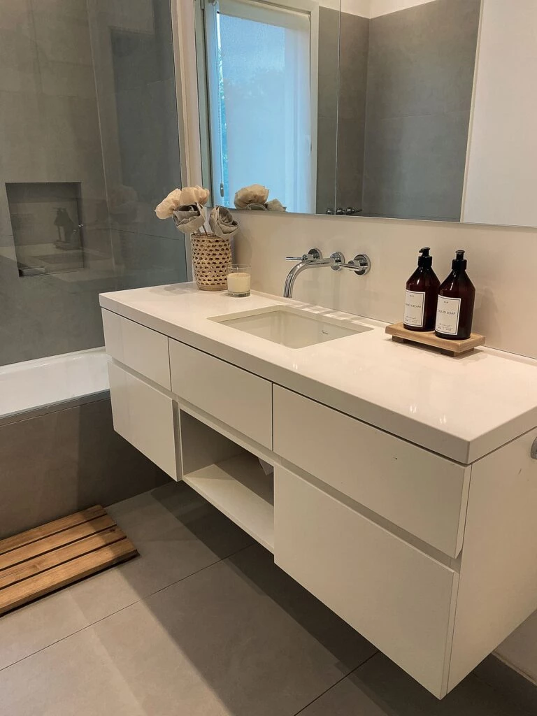Para el baño de los chicos se diseñó un mueble laqueado en blanco, con mesada de Purastone Blanco Icon y revestimiento completo (piso y paredes) en porcelanatos modelo Urban Light Grey (Vite).