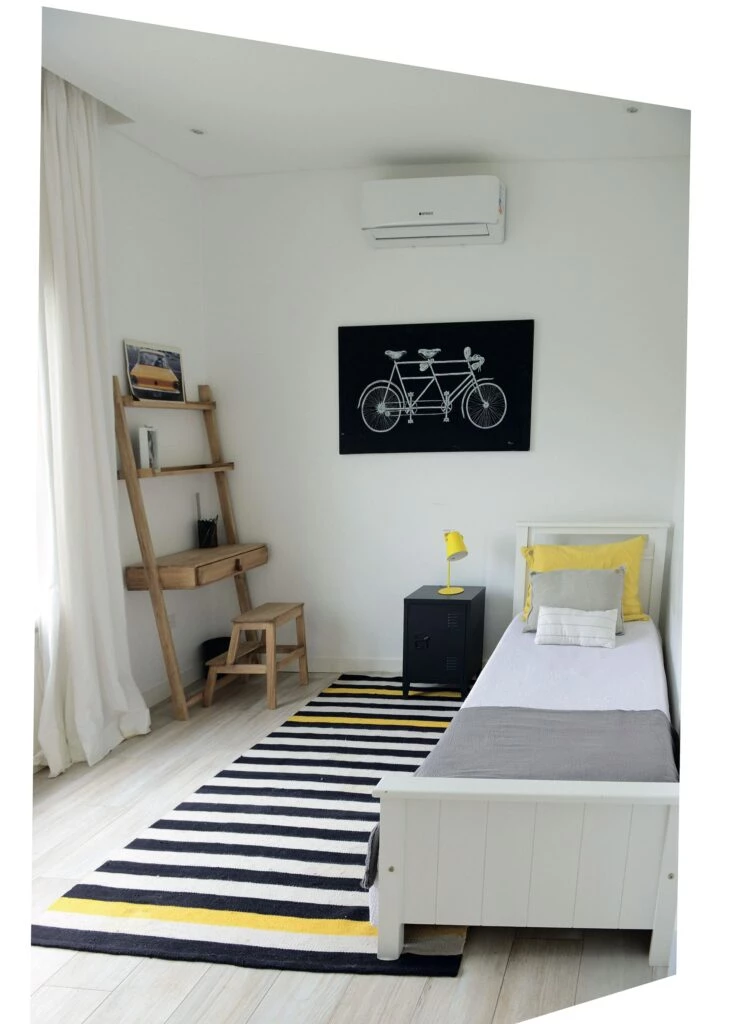 El cuarto del varón extiende una llamativa alfombra con rayas en negro, amarillo y crudo (@elementosargentinos) a los pies de la cama. La mesa de luz tipo locker en negro mate (Easy) suma un velador amarillo (@altoranchocom). Almohadones (@susahomedeco) y escritorio con alzada (@manada_almacen).