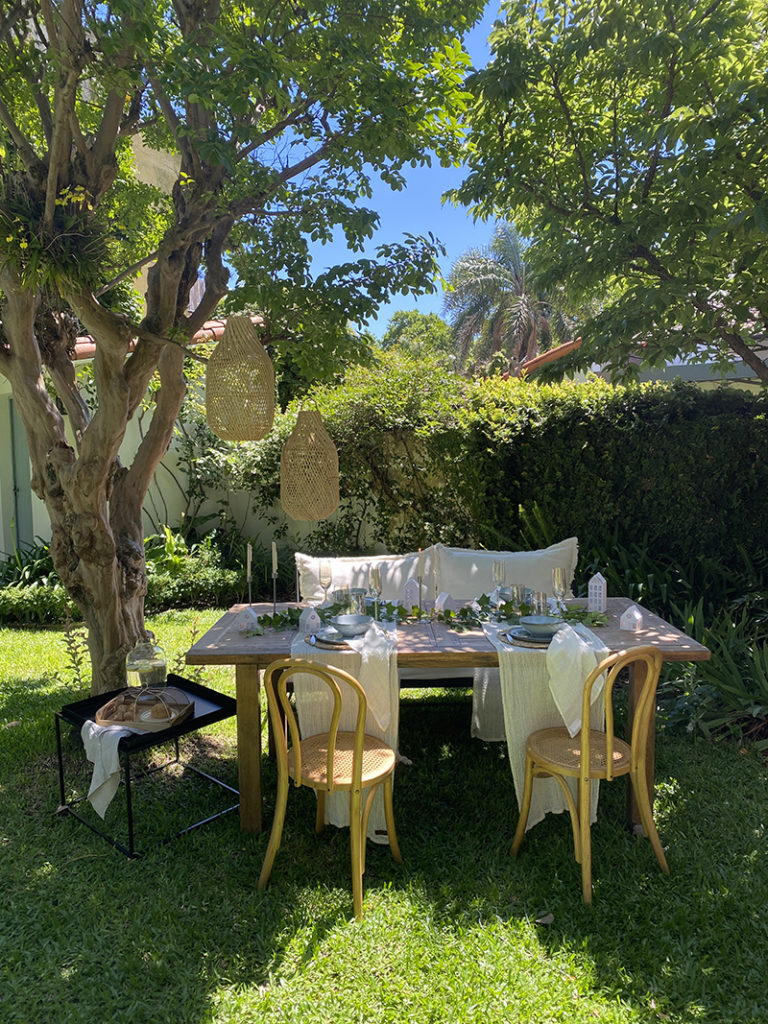 Lorena Pedace (@lorenapedace) eligió el azul, color del verano, para componer una mesa cancherísima, con toques de verde, dorado, blanco y madera. Y Clari de @boscolacasita sacó la mesa al jardín para vestirla con caminos etéreos y decorarla con unas mini casitas.
