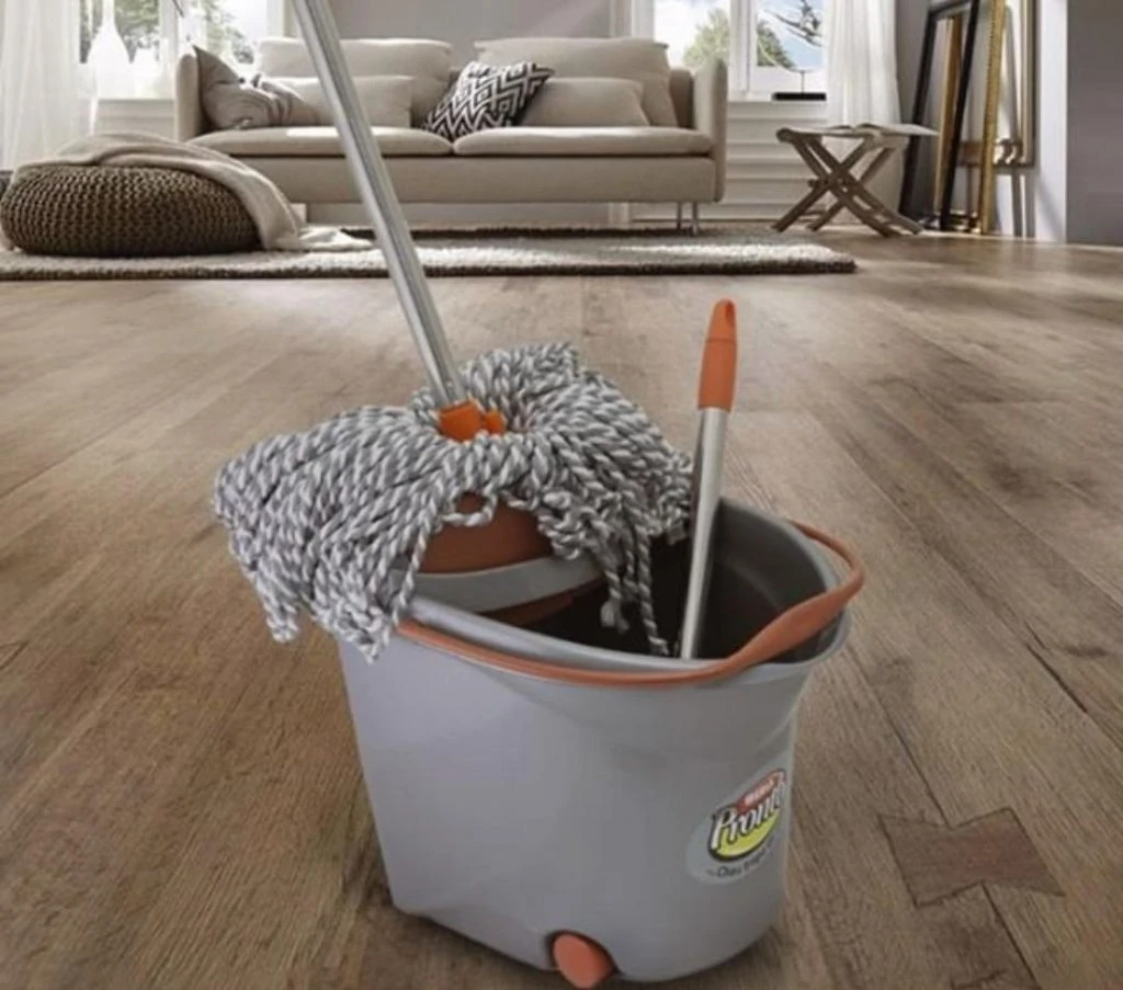 Una versión de trapeador que tiene el balde y todo a mano: ya no tenés que escurrir el trapo sucio.