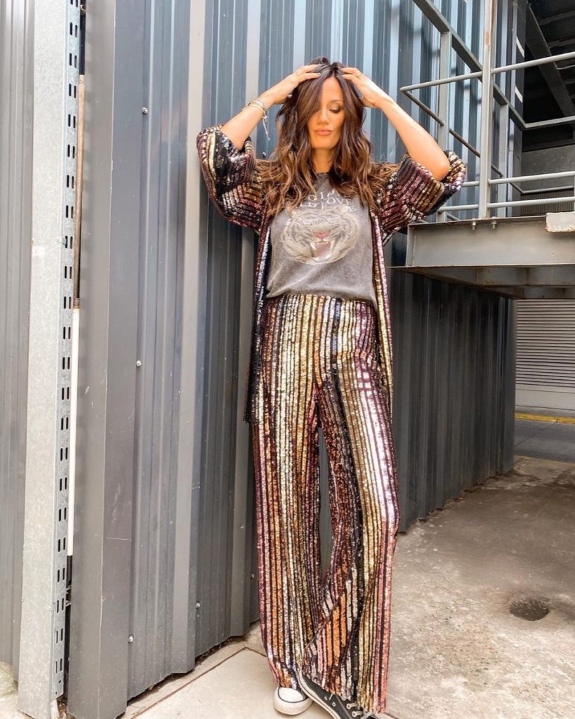 El look de noche de Paula Cháves: lentejuelas + zapatillas
