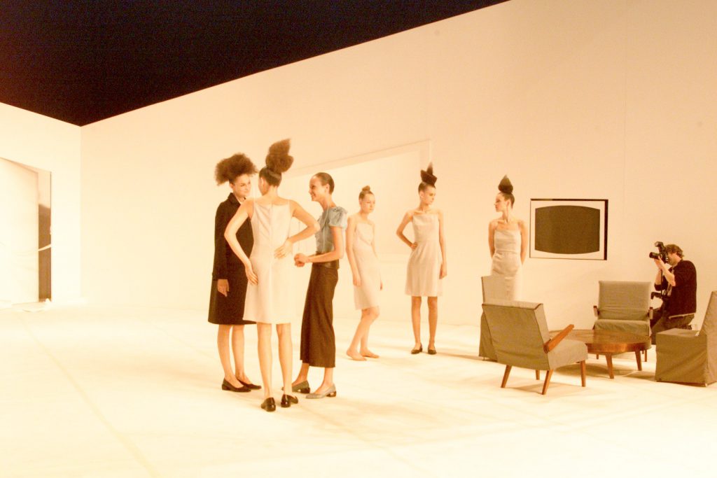 Mientras detrás de un vidrio un coro entonaba viejas canciones turcas, hacia el final del show apareció un grupo de modelos vistiendo simples enaguas grises que, sin prisa y sin pausa, desarmaron los tapizados que se convirtieron en perfectos vestidos, algunos con recortes geométricos naranja y lila.