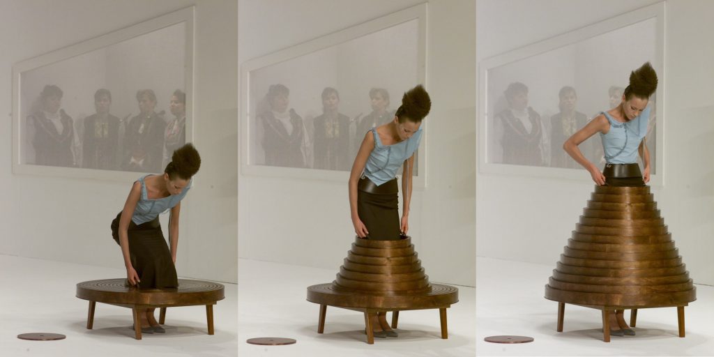 Luego plegaron los armazones de madera de los sillones hasta convertirse en valijas. Una quinta modelo enganchó la tapa de la mesa de madera a la faja de cuero transformándola en una pollera cuando las patas se plegaron hacia adentro. La audiencia fue testigo de muebles que ante sus ojos mutaron en prendas y viceversa: las valijas y los vestidos en sillones y la “pollera con volados” en mesa.