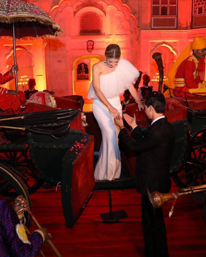 Se casaron por civil el 28 de septiembre en España. La boda en la India duró 4 días y comenzó el 24 de octubre. La primera parada de las celebraciones fue un cocktail de bienvenida en el glamuroso bar Palladio ubicado en el histórico Narain Niwas Palace Hotel. La novia eligió un vestido de Chloé y se sirvió comida occidental.
