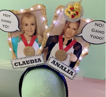 "Analía me mandó un mensaje gritando de felicidad que había quedado con Claudia para la final. Hice un croquis basado en la intriga de quién va a quedar. Se me ocurrió la confrontación de las dos, le colgué a las dos medallas y a Analía le hice la réplica de los fideos en la cabeza. Y tiene luces el tocado, estilo marquesina", explicó Gabriella.