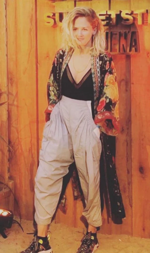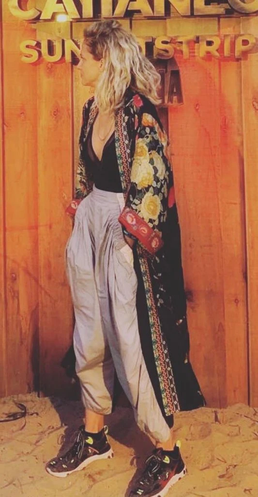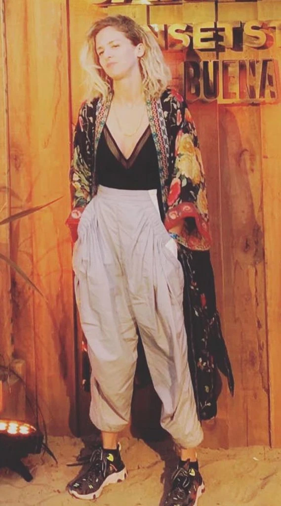 Leonora se adelantó a las tendencias y llevó un pantalón slouchy, el ítem de moda del otoño 2020. Lo combinó con body con detalles de puntillas, kimono (la prenda que no te puede faltar este verano) y zapatillas deportivas. Muy canchera para un look casual de verano.