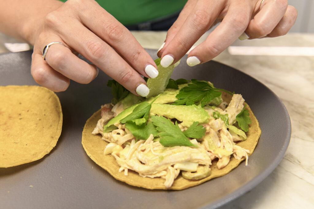 - Paso 5: Para servir, tenés dos opciones. Por un lado, la original: en forma de taco. Poné el salpicón casi hasta el borde de la tortilla de maíz y agregá palta, perejil o cilantro, y una rodaja de lima o limón como decoración.