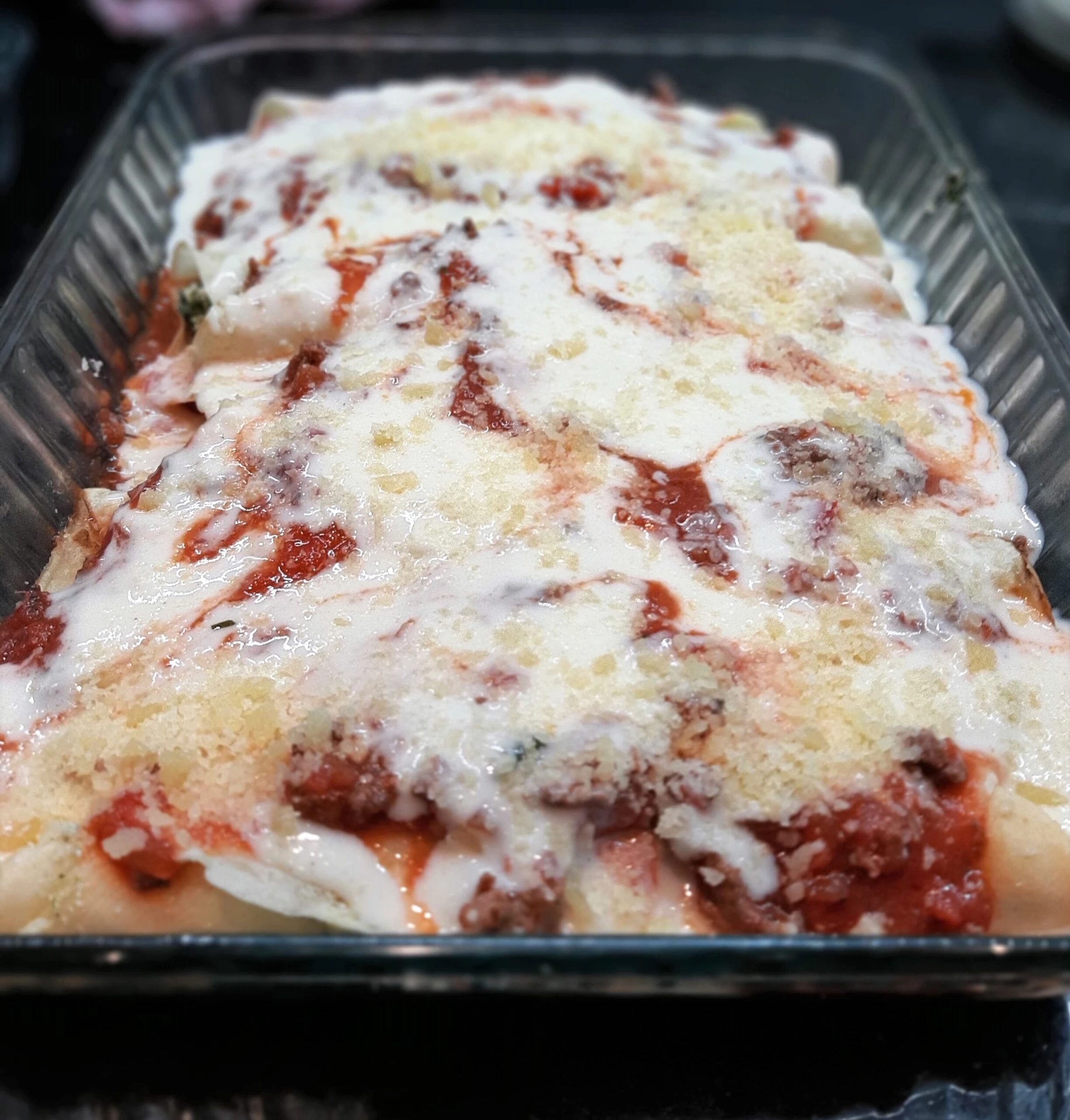 Canelones con salsa blanca y tuco