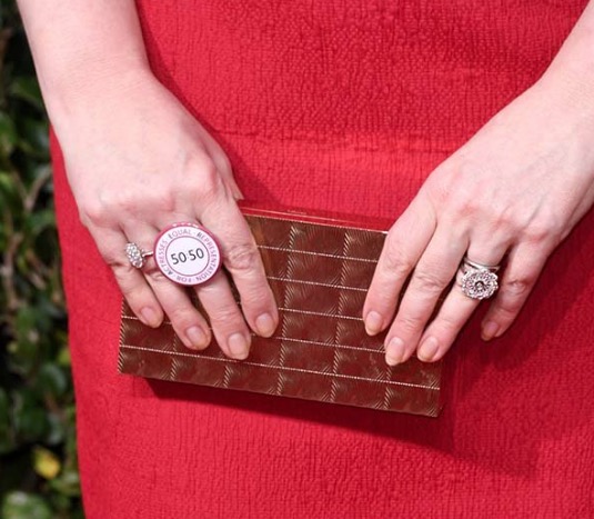 La británica Olivia Colman (sorpresiva ganadora Mejor Actriz de Televisión en una serie dramática por "The Crown") también sumó su mensaje: entre sus accesorios Olivia lució un anillo donde se leía "Igual representación para actrices, 50:50", parte de la organización ERA 50:50 que promueve el balance de género en la industria. La "reina" estuvo en todo.