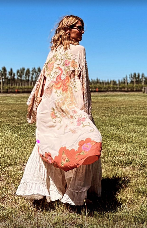 Fiel a su estilo súper canchero, la DJ eligió un look boho chic compuesto por un kimono vintage con estampa oriental en los tonos del rosa.