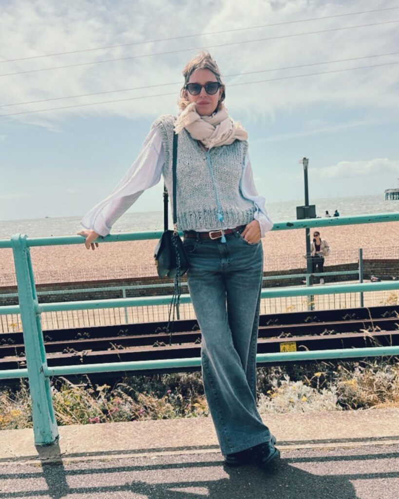 En uno de sus recientes looks, Dolores llevó un chaleco de lana de llama, artesanal, de color celeste, que usó sobre una camisa de lino de mangas campana y un jean ancho. Completó su outfit, ideal para un día primaveral algo fresco, con una bufanda en color nude.