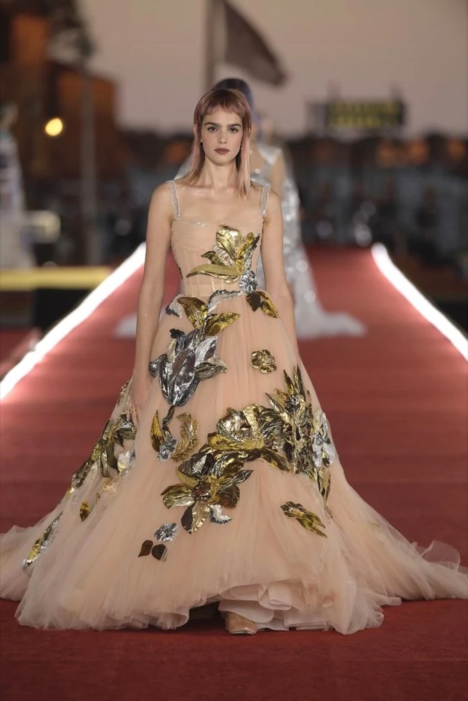 Los primeros looks de Alta Moda incluyen un vestido de tul pintado a mano y corsé de organza doble, un vestido de Georgette completamente bordado con lentejuelas, cuentas de corneta y cristales y un vestido de corsé de encaje de lúrex bordado con punto de cruz.