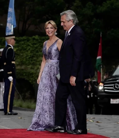 Fabiola Yáñez acompañó a Alberto Fernández en el cierre de la Cumbre de las Américas que se está llevado a cabo en los Estados Unidos. Y como en todos los actos que se llevaron a cabo en estos días, la primera dama argentina causó impacto por su look. Para la gala del cierre, Fabiola llevó un espectacular diseño de Laurencio Adot: vestido semi armado de brocato en color celeste, con escote en V profundo, con broche de strass.