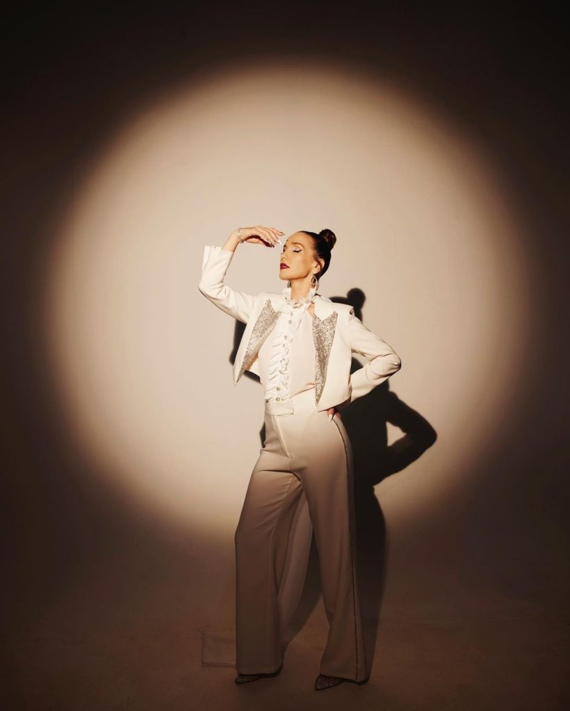 Oreiro lució un diseño de Natalia Antolin compuesto por un blazer con brillos, pantalón sastre tiro alto, y camisa con cuello con jabot, y detalle de moño en espalda. Para completar este look fueron claves los accesorios: aros Rondinelle, anillos y antifaz con cristales, también fueron los protagonistas de este outfit.