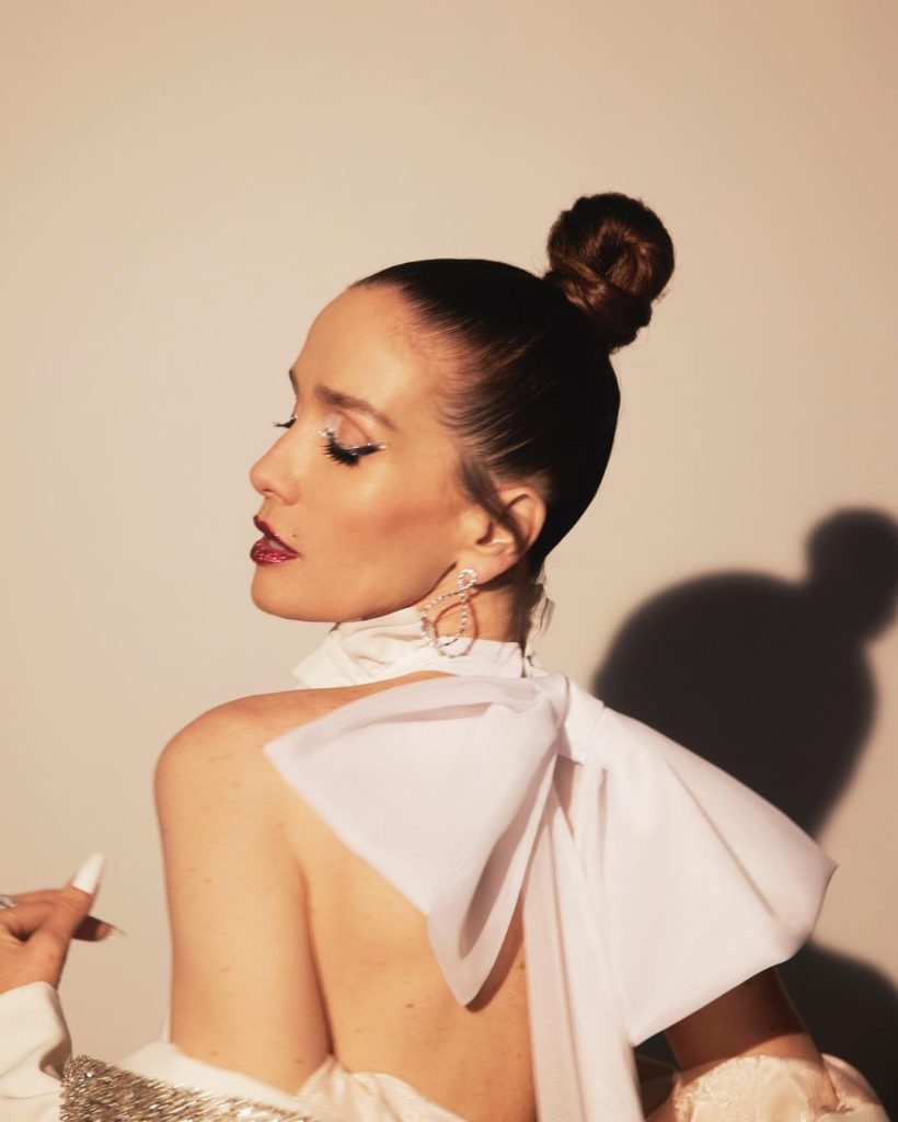 En cuanto a su make up, optó por labial tono rouge con brillos y mucho strass sobre sus párpados. Esto también se vio reflejado en su manicuría: uñas gelificadas, con detalles de brillos y strass. Por otro lado, también se destacó su peinado, un recogido alto, que siempre otorga estilismo y elegancia.