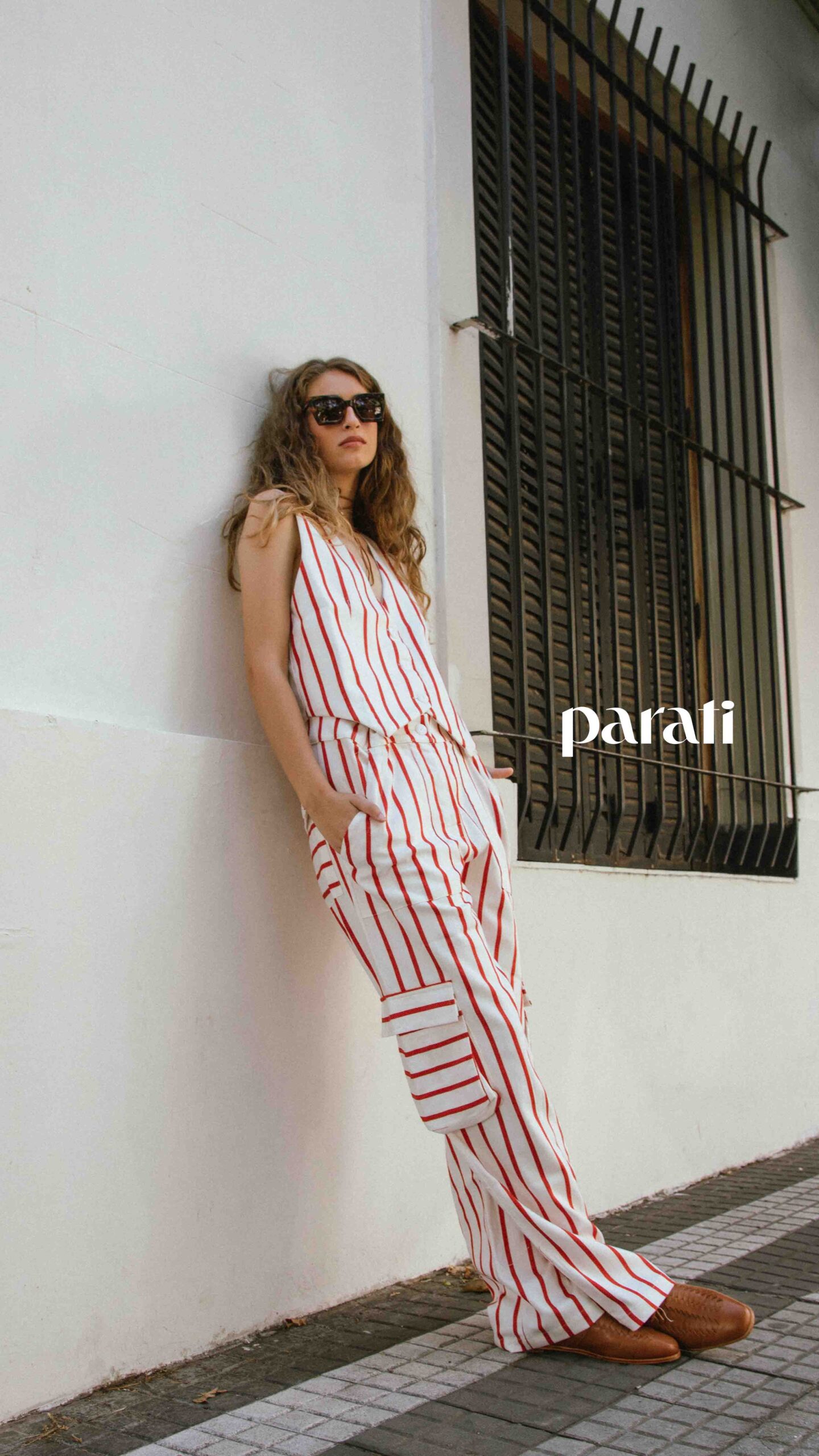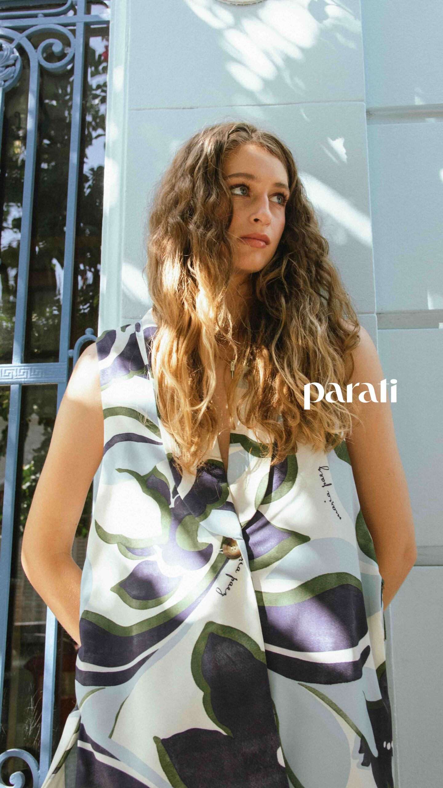 Chaleco con tajos laterales y pantalón estampado (María Paez, @mariapaezarg), sandalias de cuero (Fiskyn, @fiskynzapatos) y aros y collar con dije (Barzón, @barzon.store).