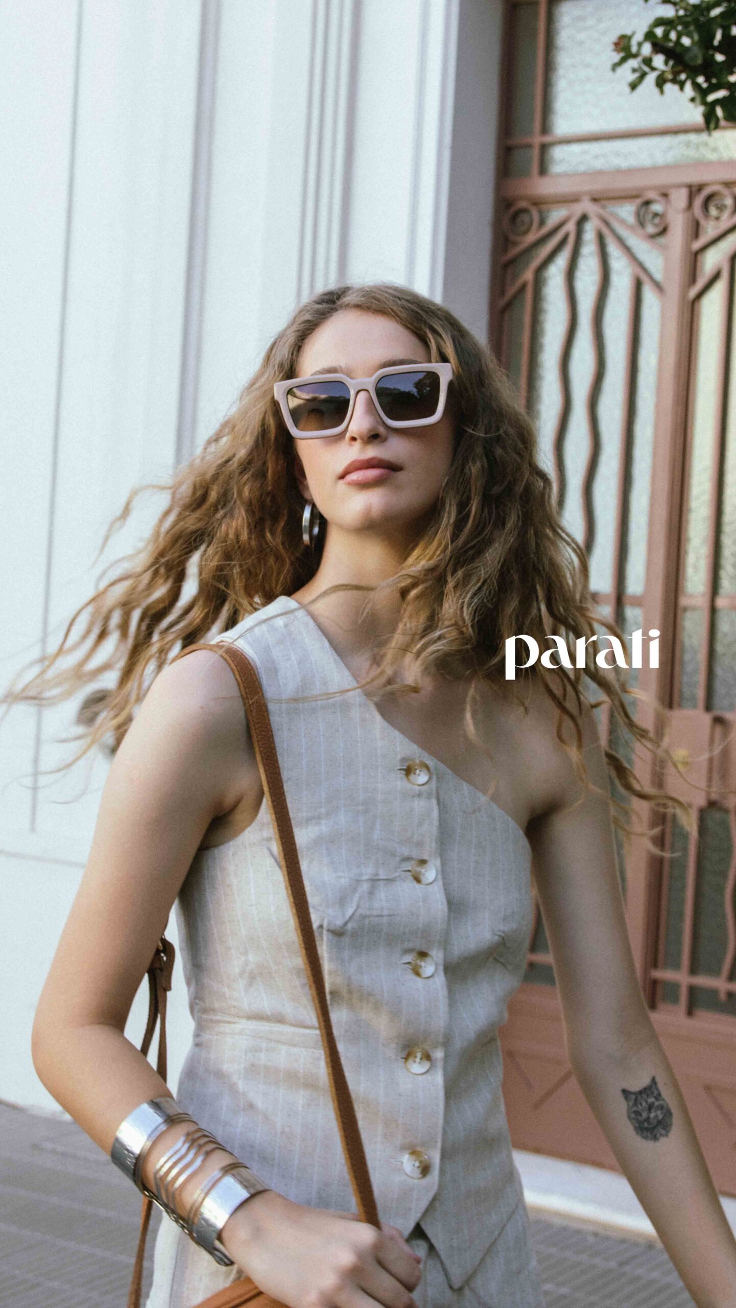 Chaleco de un hombro y short de lino (Tefka Studio, @tefkastudio), chatas de cuero con apliques y bandolera de cuero (Lu Boloque, @luboloquebags), aros y esclava metálica (Lolas Complementos, @lolascomplementos.oficial) y anteojos de sol (Hardem, @hardem_official).