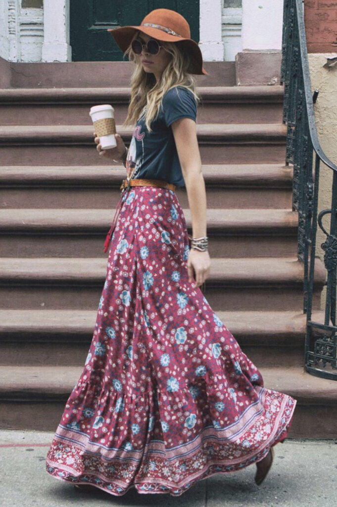 Si queremos lograr un look canchero y muy a la moda como el de la foto esto es lo que necesitamos: remera estampada, falda maxi estampada con flores, cinto a la cintura, capelina de paño y botas.