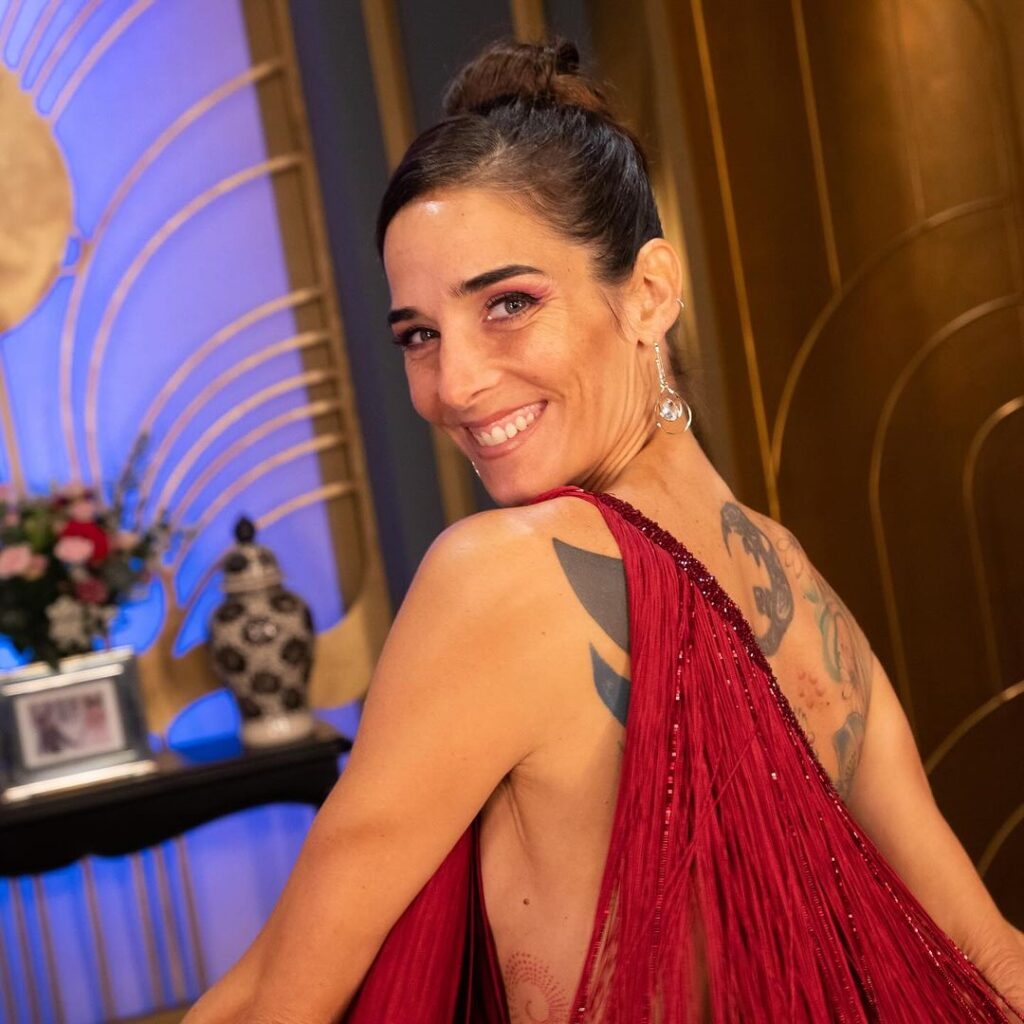 Juana Viale volvió a causar impacto en la mesaza de este domingo luciendo un vestido de Gino Bogani de la década del '80. La pieza, un deslumbrante diseño de flecos y mostacillas, todo en color borravino, fue diseñado por el modisto en 1981, tal como contó la conductora.