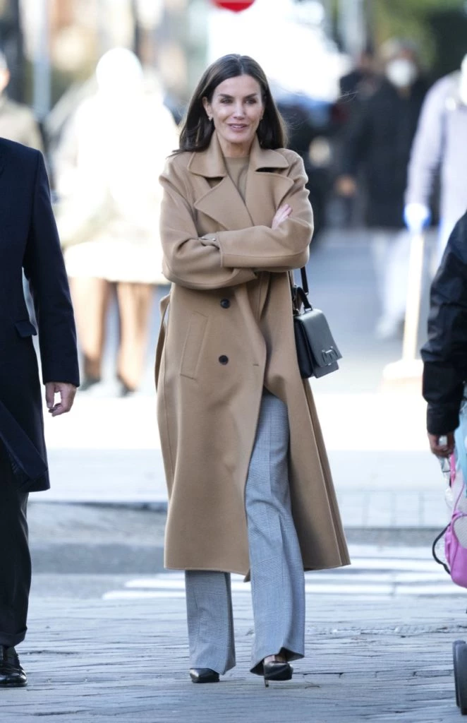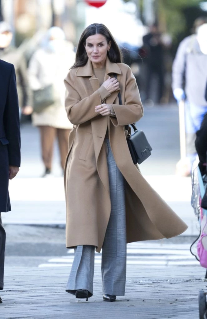 Para combatir las bajas temperaturas, la reina de España adoptó un clásico tapado largo con lazo que elevó su estilismo laboral. Lo combinó con un suéter camel, pantalones rectos con estampa Príncipe de Gales, cartera de cuero negra y unas botas de cuero en punta.
