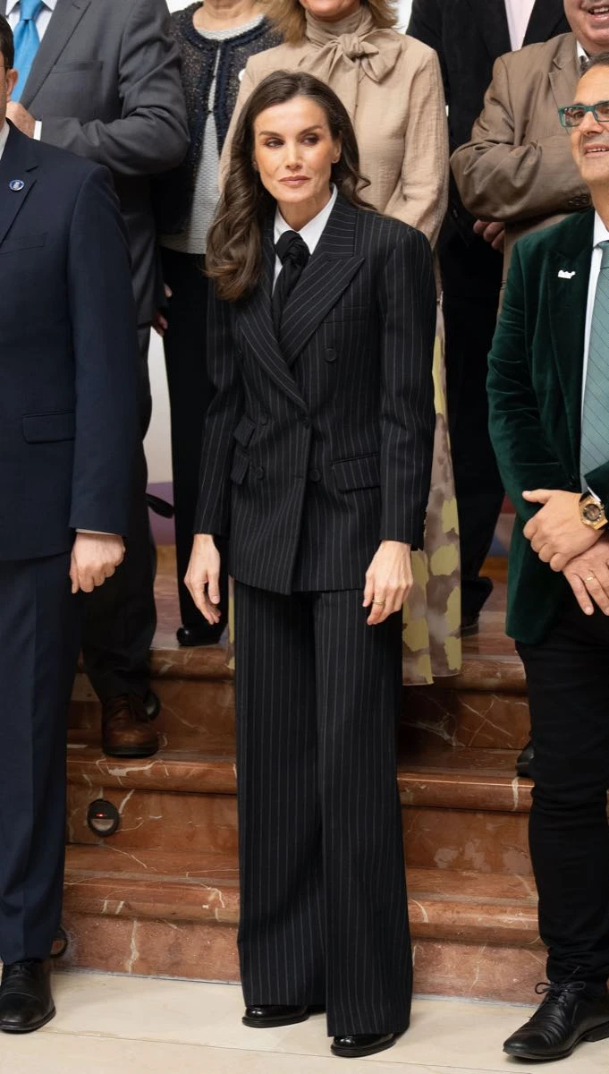 En esta oportunidad, la mujer de Felipe VI lució un traje de raya diplomática compuesto por un blazer cruzado de doble abotonadura con hombros bien marcados y amplia solapa que llevó con pantalones anchos a juego, ambos de la firma francesa Sandro.