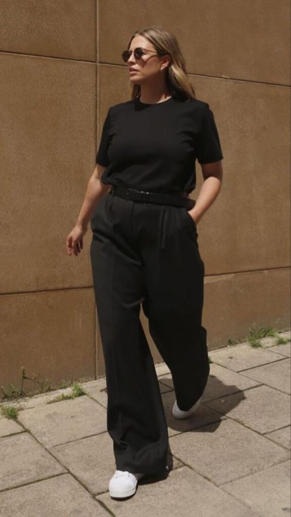 Remera básica, pantalón sastrero y cinto: una combinación infalible en negro. La pequeña licencia de este total black look son las infaltables zapatillas blancas.