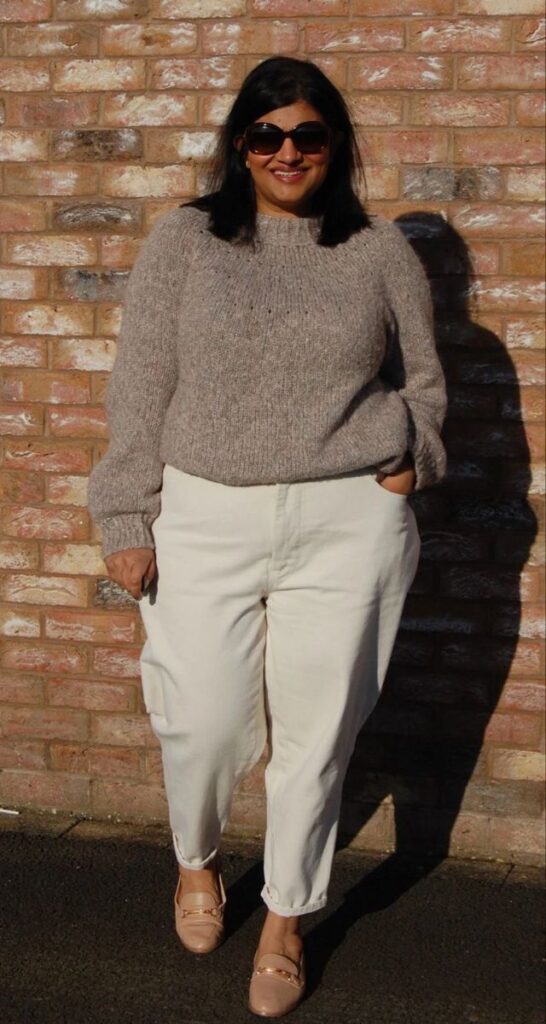 El verde militar es un tono al que podemos considerar casi neutro, dado que combina con la mayoría de los colores. Y que va de maravilla con los neutros clásicos, como este suéter beige
