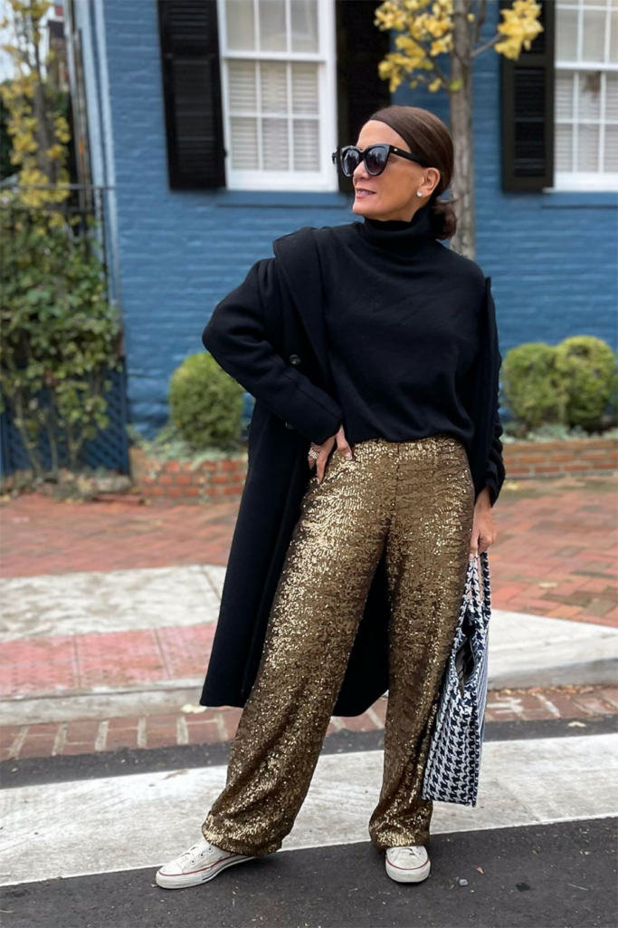 Podés elegir una falda midi con pailettes, sumarle tus zapatillas de cuero y un buzo jogger.