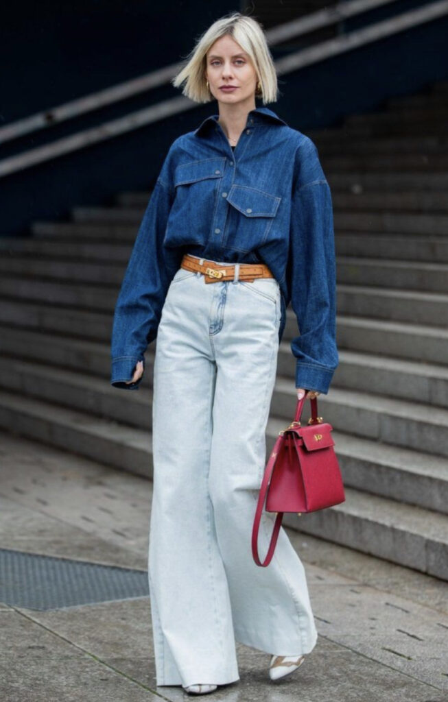Jean claro wide leg tiro alto, camisa azul oscuro y cartera fucsia. Porque el look denim total también vale combinando distintos tipos de denim.