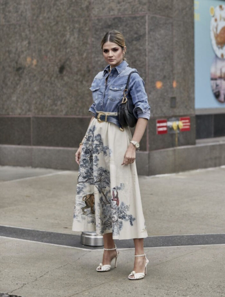 La camisa de jean es tan versátil que también se adapta a looks fashionistas como el de la foto. Además, miren lo bien que queda con una falda midi estampada y sandalias de taco alto.