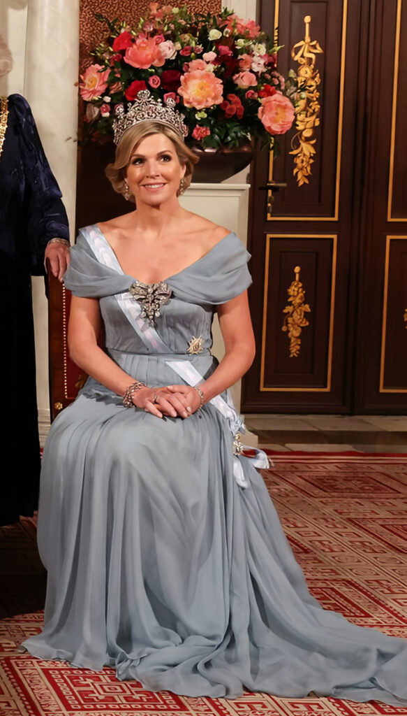 Como un guiño a los reyes de España, Máxima eligió un diseño de ese país. La argentina llevó un vestido de Jantaminiau que combinó con la tiara Stuart. Una diadema encargada a petición de la reina regente Emma en 1897 para la proclamación de su hija la reina Guillermina. Una de las joyas más importantes que posee la realeza, y que solo utilizan en ocasiones especiales.
