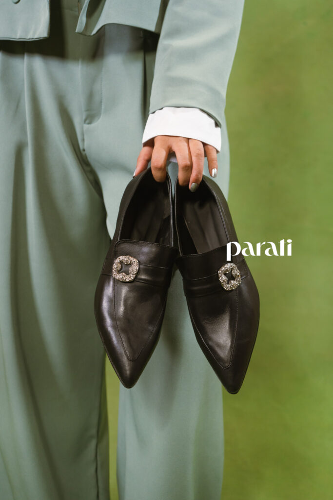 Blazer corto y pantalón sastrero ($13.500 y $11.300, Nare, @nare.moda), camisa de poplín ($19.600, Pieta, @pieta_official) y mocasines de cuero ecológico con hebilla (Vita Bella, @vitabellashoes).