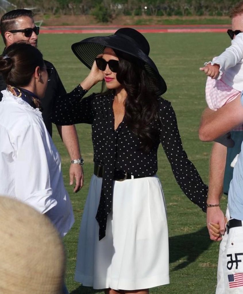 La duquesa de Sussex llevó una blusa negra a lunares anudada a la cintura, una falda color hueso, con cinto ancho de cuero, que complementó con capelina y stilettos. Un look veraniego, ideal para este tipo de eventos, que incluye piezas de Khaite, joyería de Cartier, y también las gafas de sol favoritas de Meghan, firmadas por Valentino.