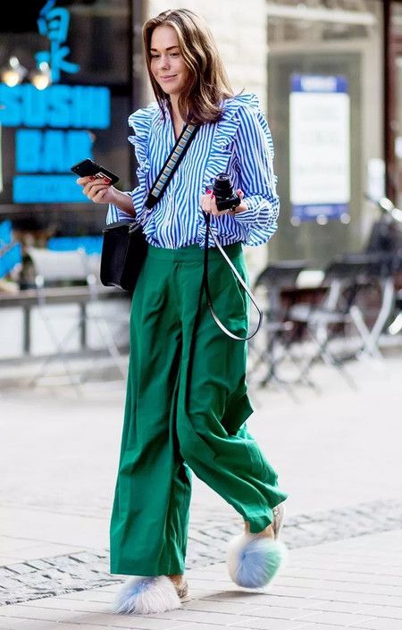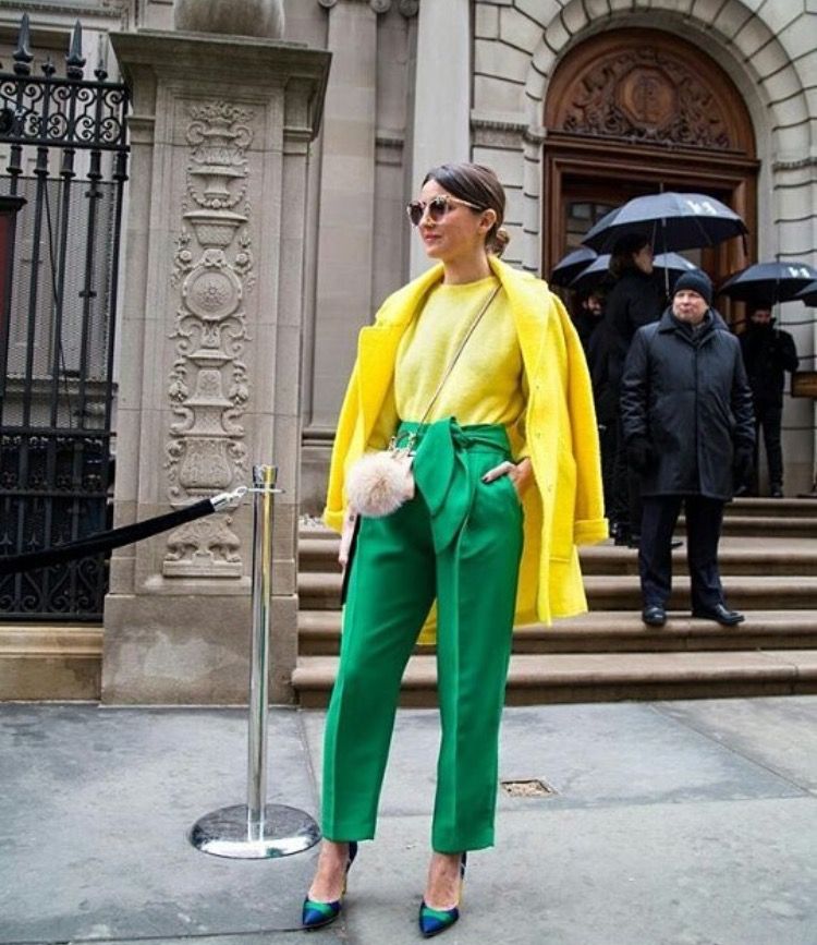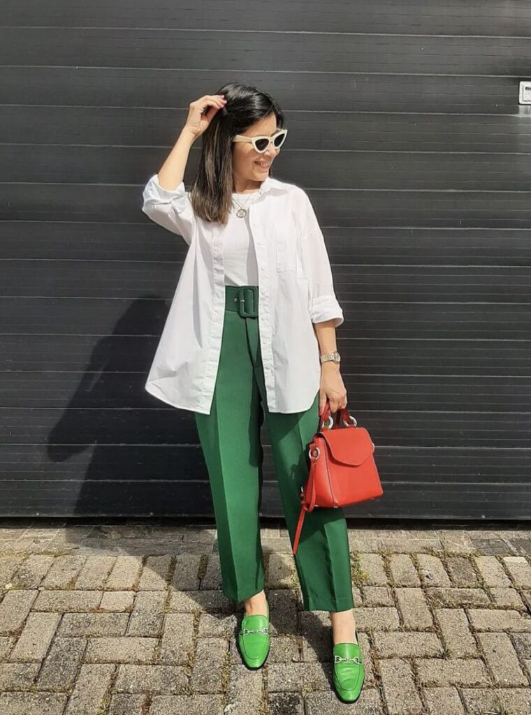 Una alternativa fácil es armar total look, o sea que combines la parte de arriba también en verde al igual que los pantalones.