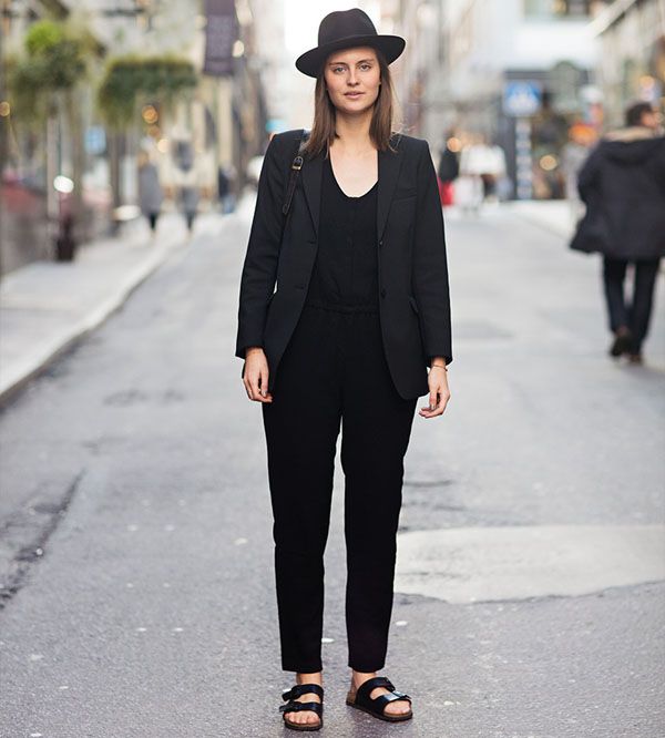 Son las sandalias normcore, que eligió en color negro para completar su look sastrero de chaleco y minifalda cruzada, un modelo conocido como "portafolio".